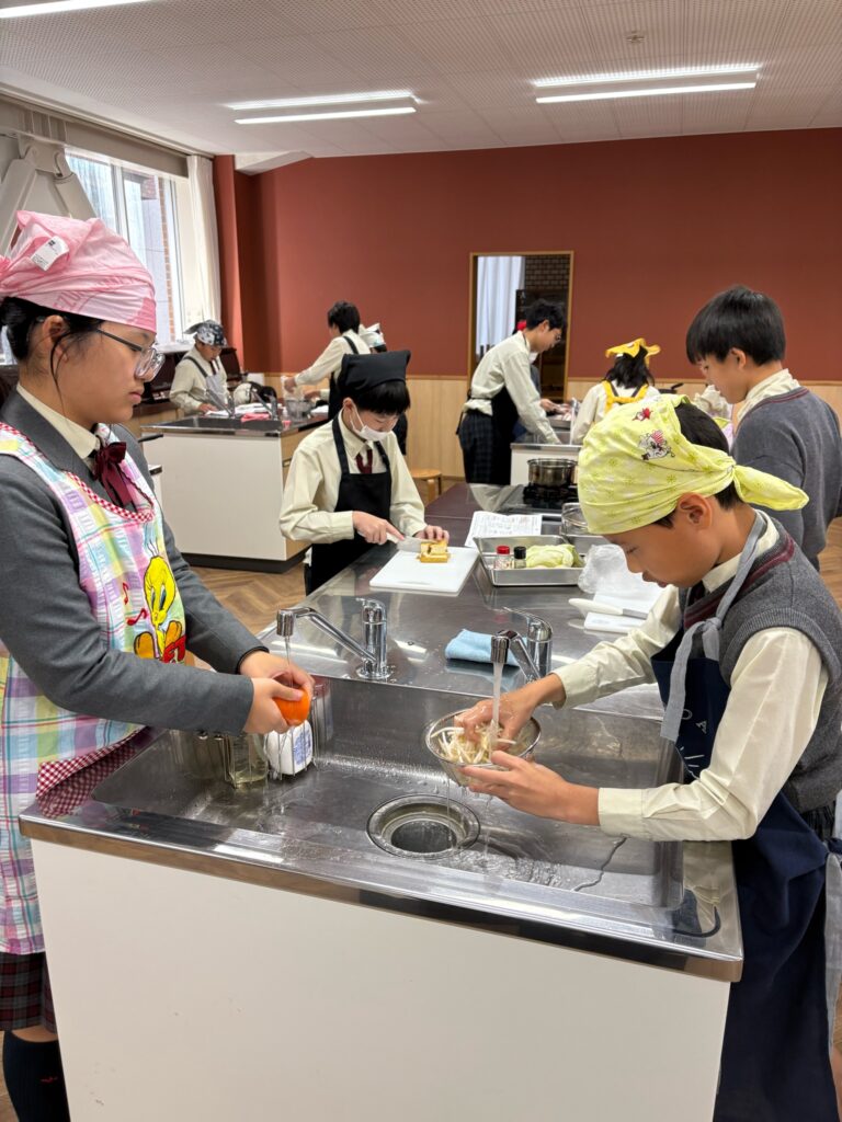 家庭科の授業で、『厚あげと野菜のチャンプル―』の調理実習をしました。安全に気をつけて、グループで協力しながら作業を進めていました。野菜の切り方やゆでるかたさなどに注意しながら楽しく調理をしていました。自分たちの作った料理を満足そうに試食していました。