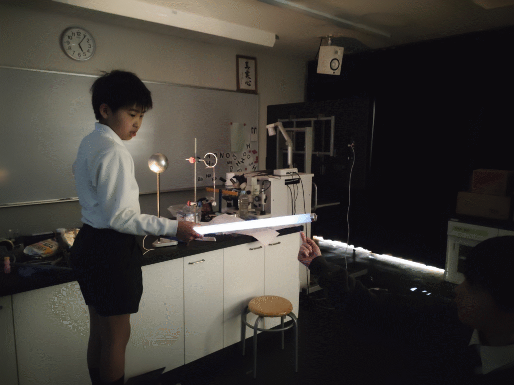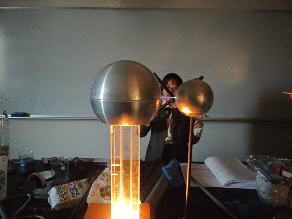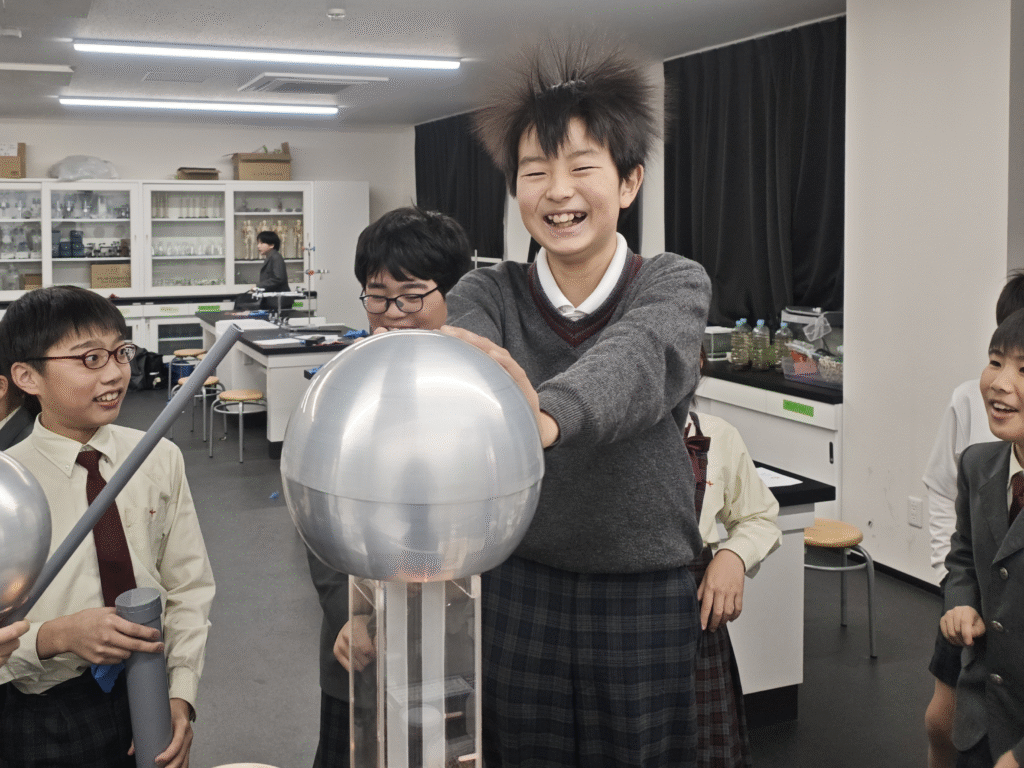 1月は静電気についての学習です。日常生活や理科の実験などで身近な電気が、人や物に溜まることを体験しました。光華中学校より大型の静電気発生装置を借りてきて、体に静電気が溜まると髪が逆立つ様子や、手で握った蛍光灯が一瞬光るなど驚きの現象が観察できました。