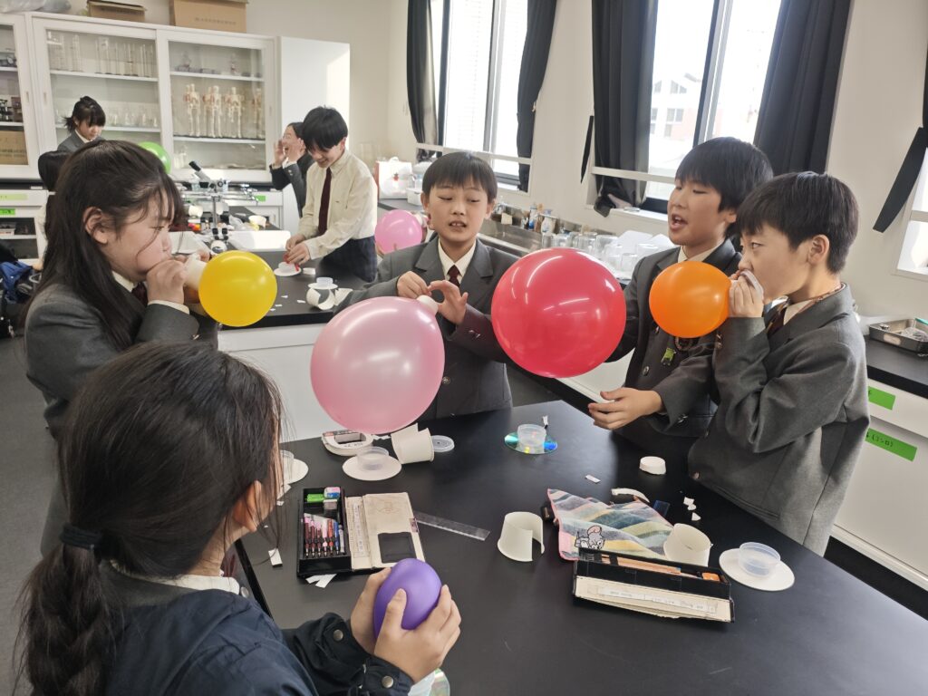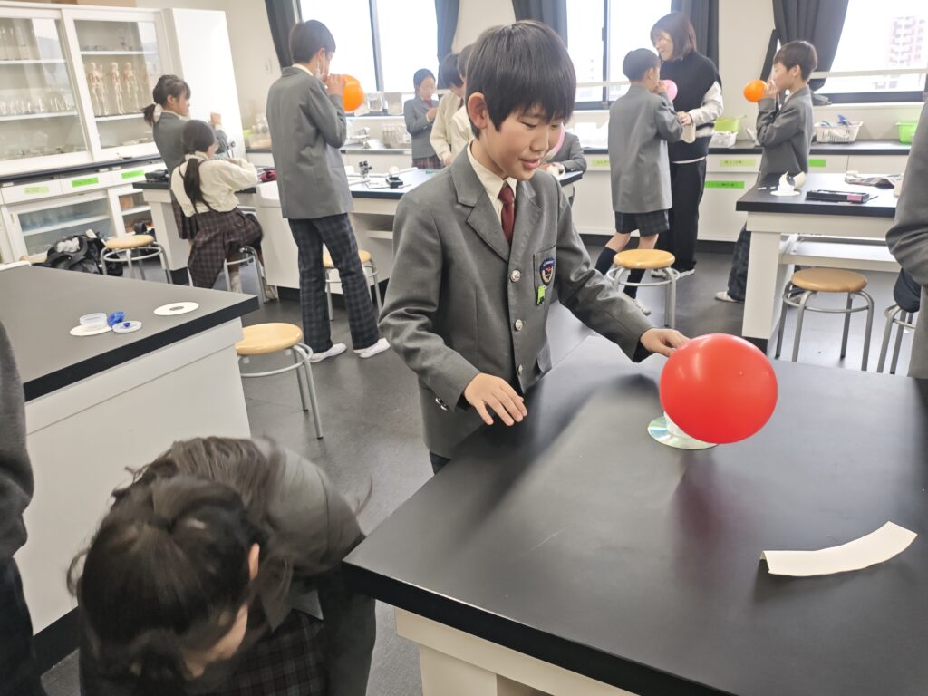 今月のハイクラス理科では、ホバークラフトを作りました。風船から少しずつ押し出される空気によって少しだけ宙に浮き、スルスルと滑っていきます。閉じ込めた空気の力を楽しく体感できました。