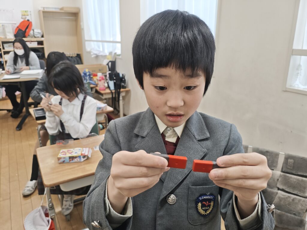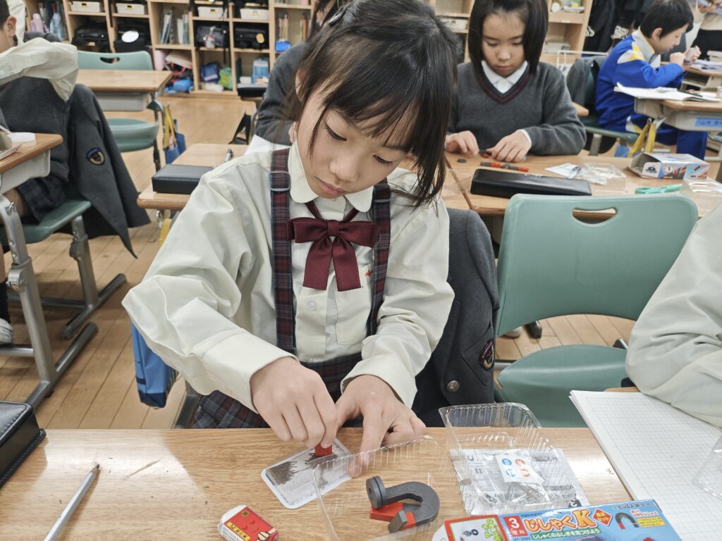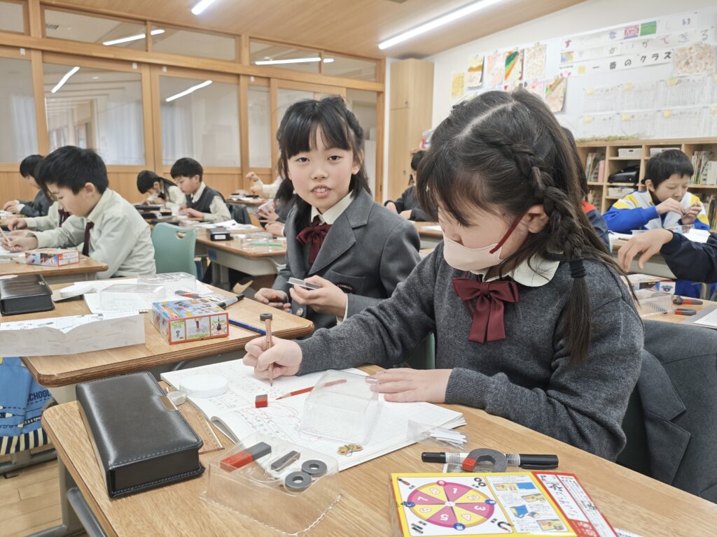 子どもたちも楽しみにしていた磁石の学習が始まりました。生活の中でもとても便利な磁石ですが、改めて調べてみるとふしぎがたくさん見つかります。鉄以外にも磁石につく金属はあるのか、石やガラスはどうなんだろうと様々な予想が出てきました。次回以降実験で確かめていきます。