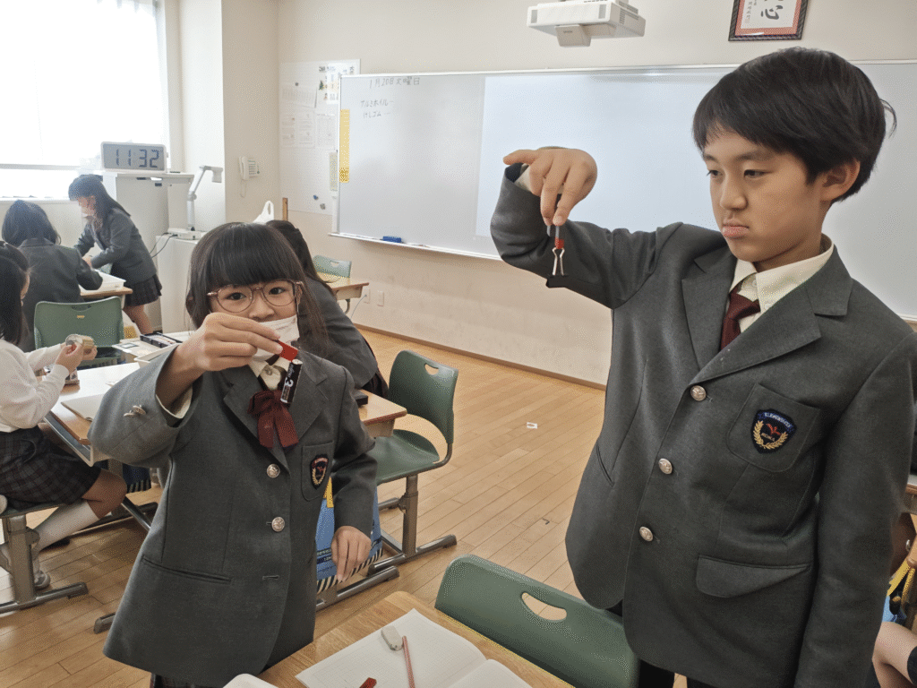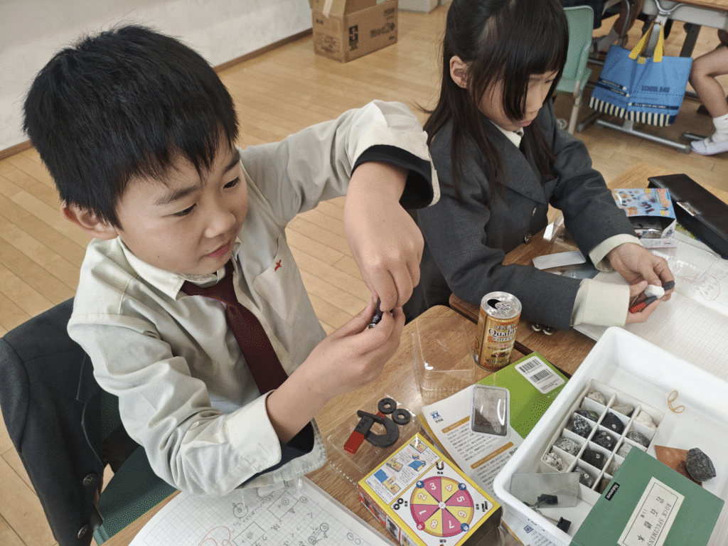 「磁石にくっつく物を探そう」理科の授業で磁石につく物は何か実験で確かめました。子どもたちの予想で多かったのは「金属ならくっつく」というもの。確かめてみるとアルミや銅でできたもの、日本のお金はくっつきませんでした。光華中学校から金属標本を借りてきてくわしく調べると、鉄やニッケル、コバルトなど一部の金属だけが磁石にくっつくことが分かりました。
