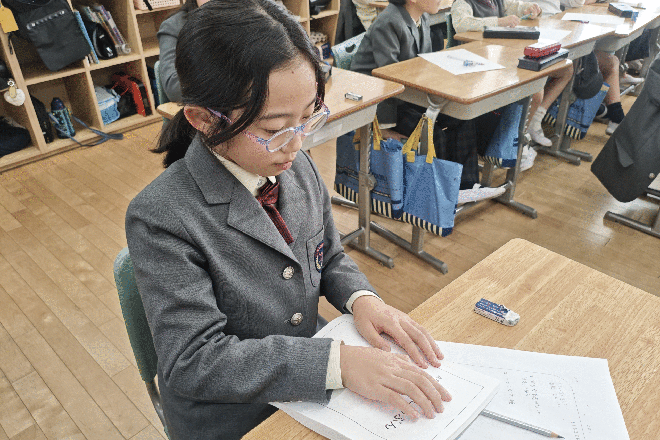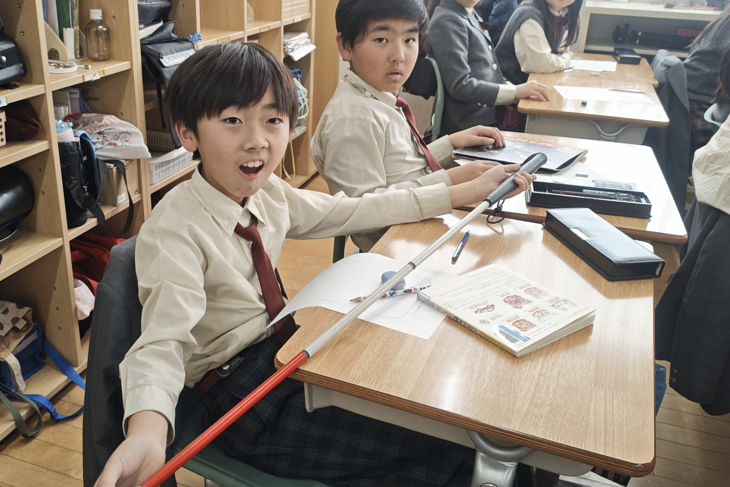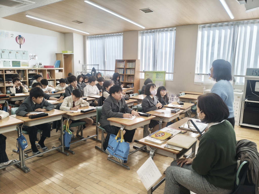 京都府視覚障がい者協会より講師の先生をお招きしての出前授業。目が見えない、見えにくい方が普段どのように過ごしているのか、どのような困りごとがあるのかを子どもたちに直接語ってくださいました。そして、白杖を持っている方への声の掛け方やお手伝いの方法を教えていただきました。